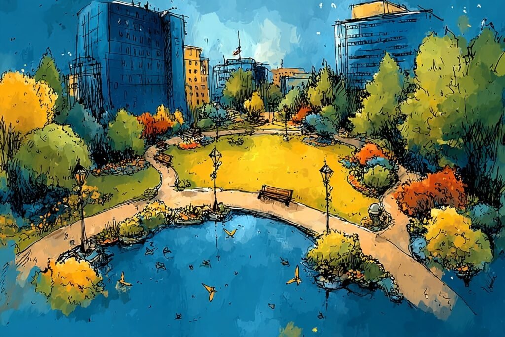 Square de 2 000 m² : pelouses abîmées, manque d’ombre, cheminements boueux, demandes des habitants (bancs, plantations, zones calmes). Objectifs : confort, accessibilité, biodiversité, entretien raisonnable.